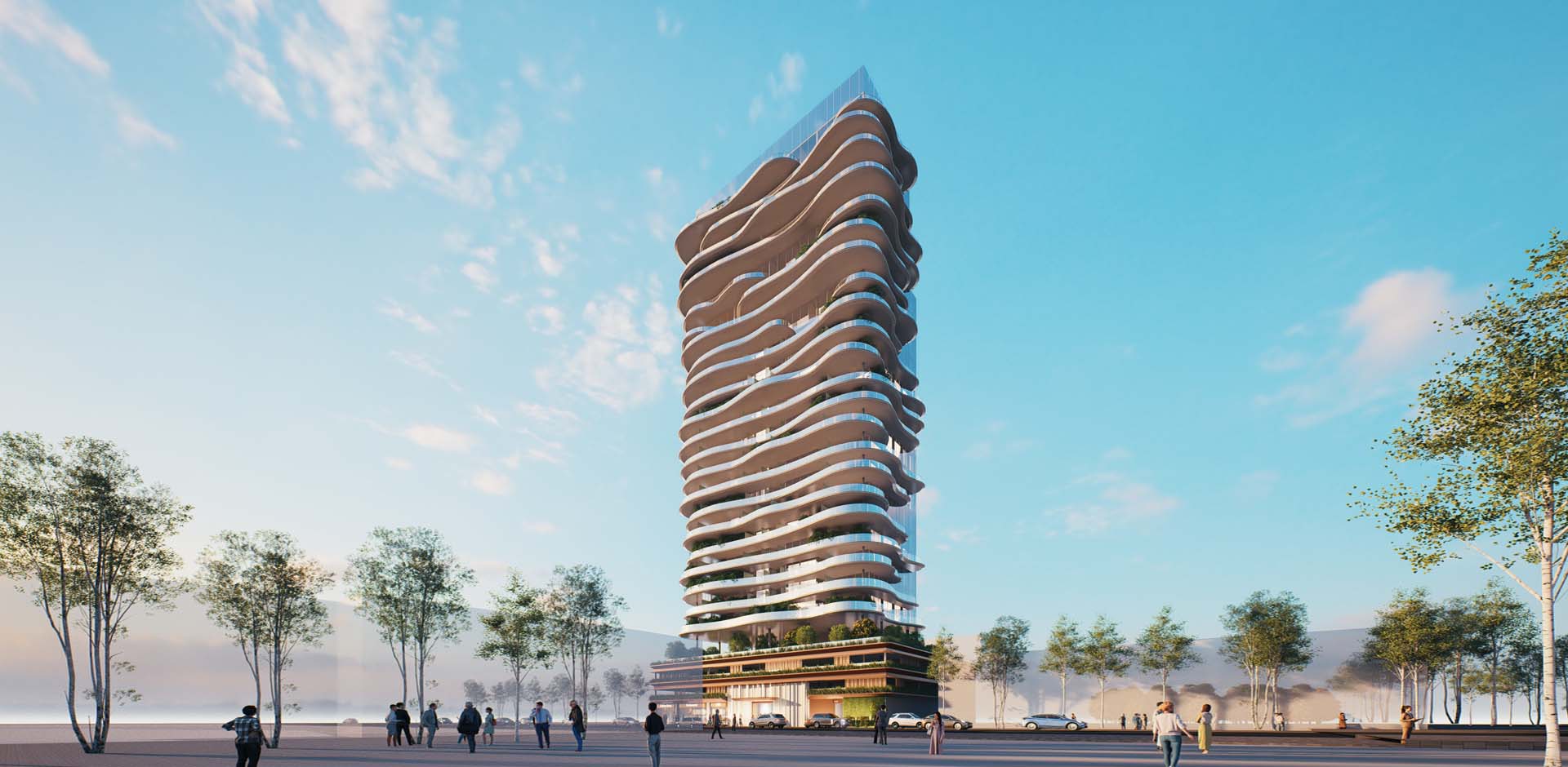 The project is located in the core of Auckland, New Zealand, which features a luxurious apartment tower with 23 floors and a height of 82m. The base of the building accommodates multiple levels of public amenities, with the form setting back gradually to create a pedestrian-friendly street interface. The elevated level combines functions such as an aerial swimming pool and landscape, forming an aerial garden. On the facade of the tower, irregular curves simulate the flowing image of the ocean, creating a unique urban image.